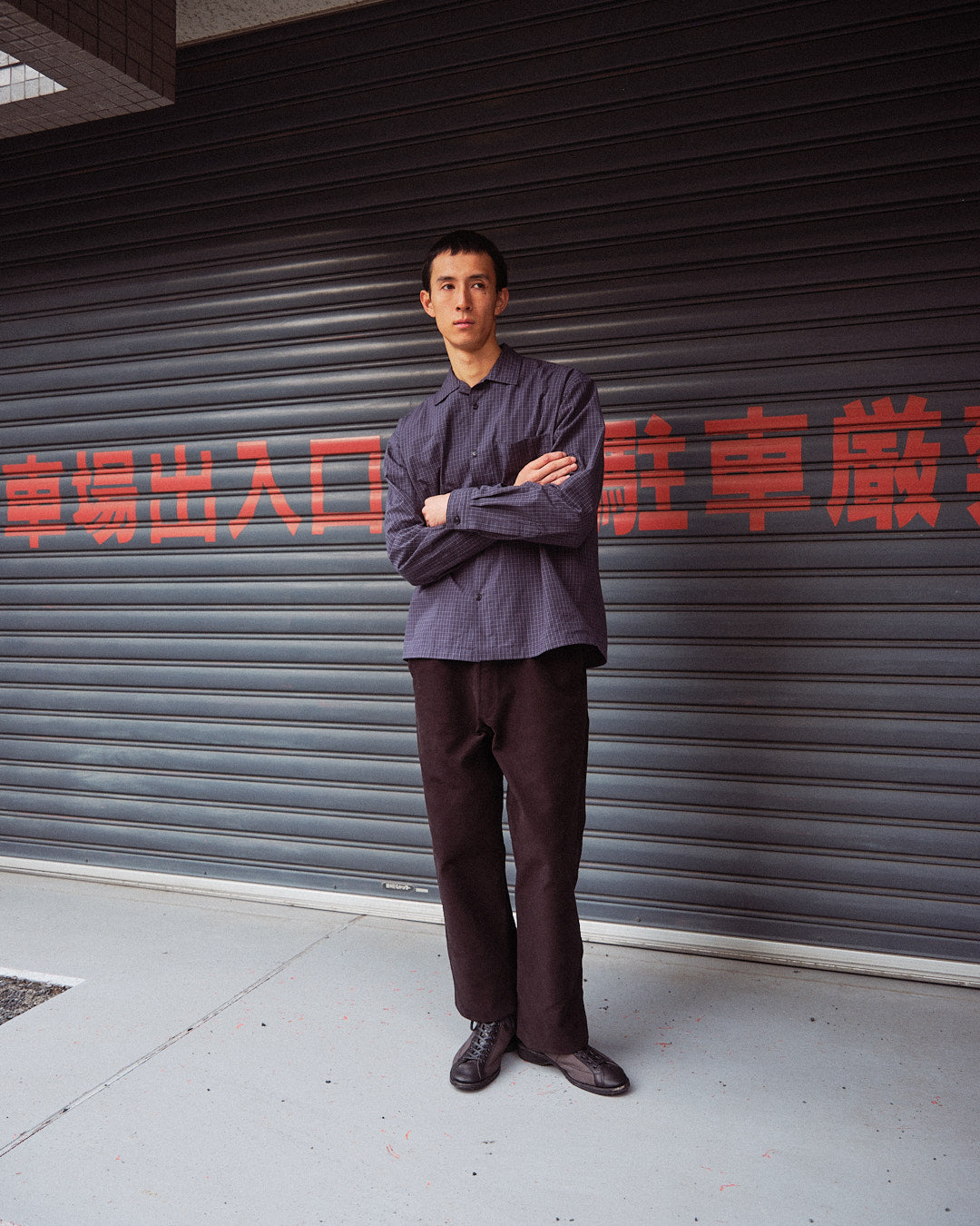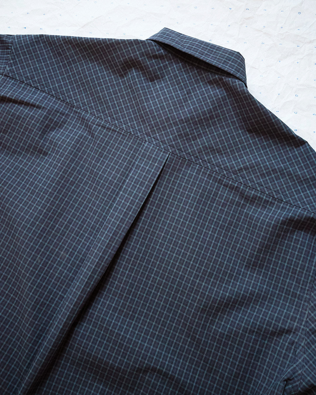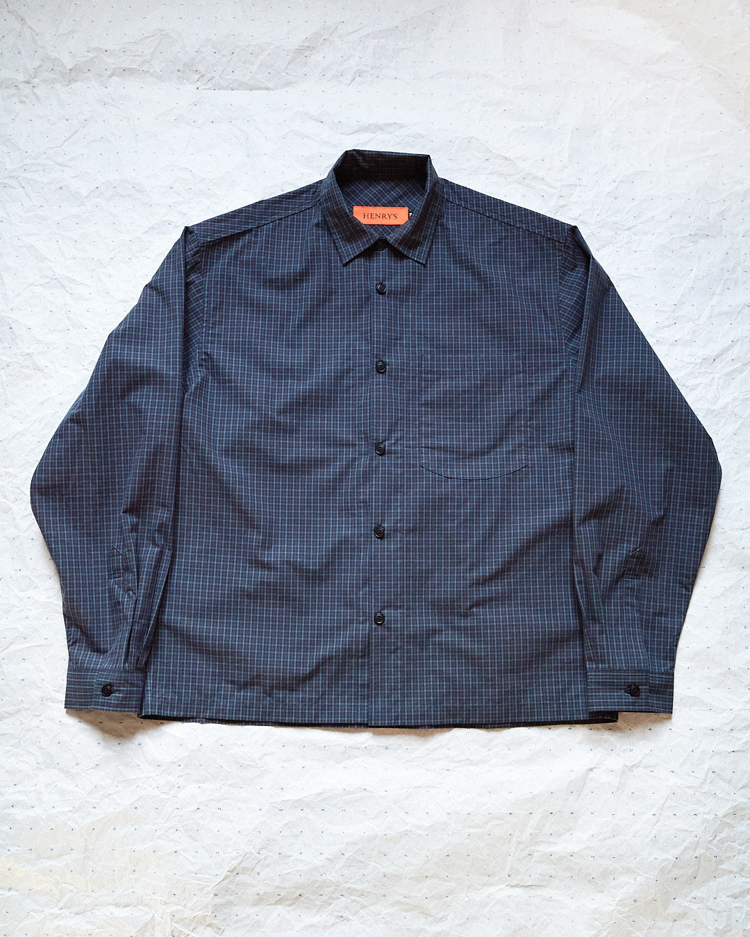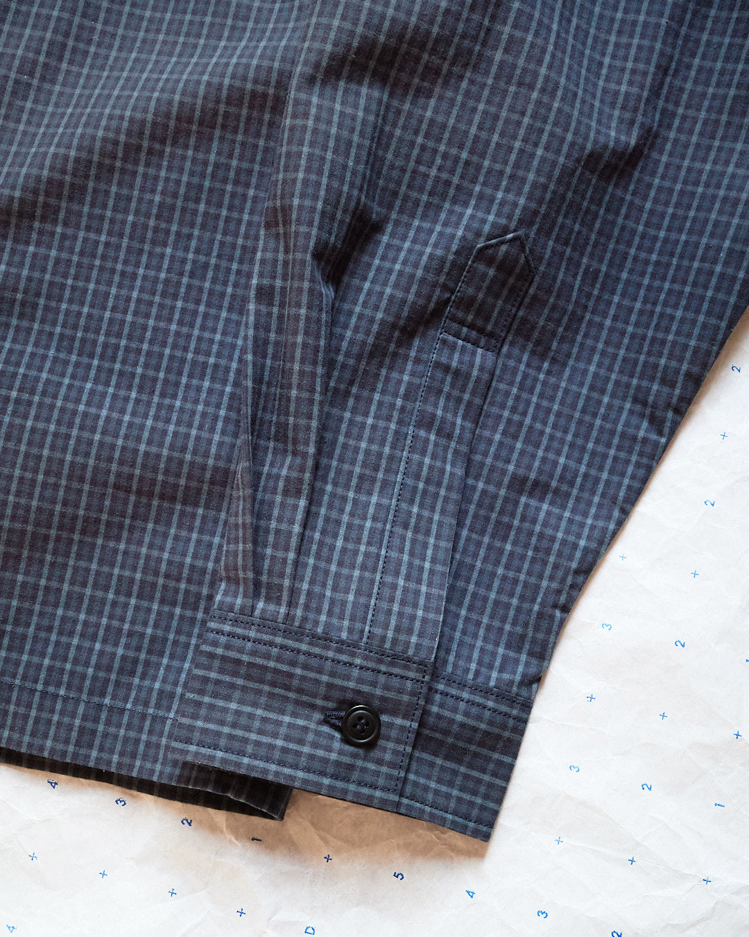 - Produced in a densely woven, yarn-dyed cotton poplin from Japan in a navy/grey check pattern.